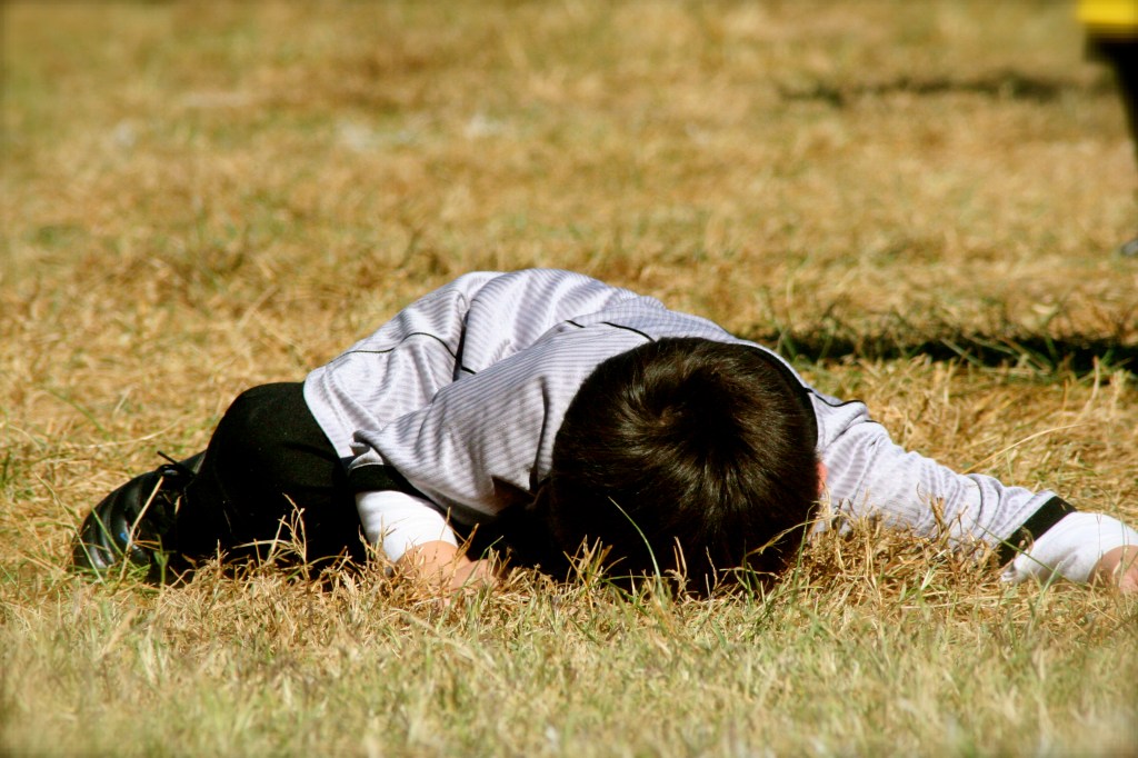 Splat. Clinton dropped himself face first in the grass. And there he stayed until his coached pulled him out. When he returned to the field, he resumed his horizontal position.